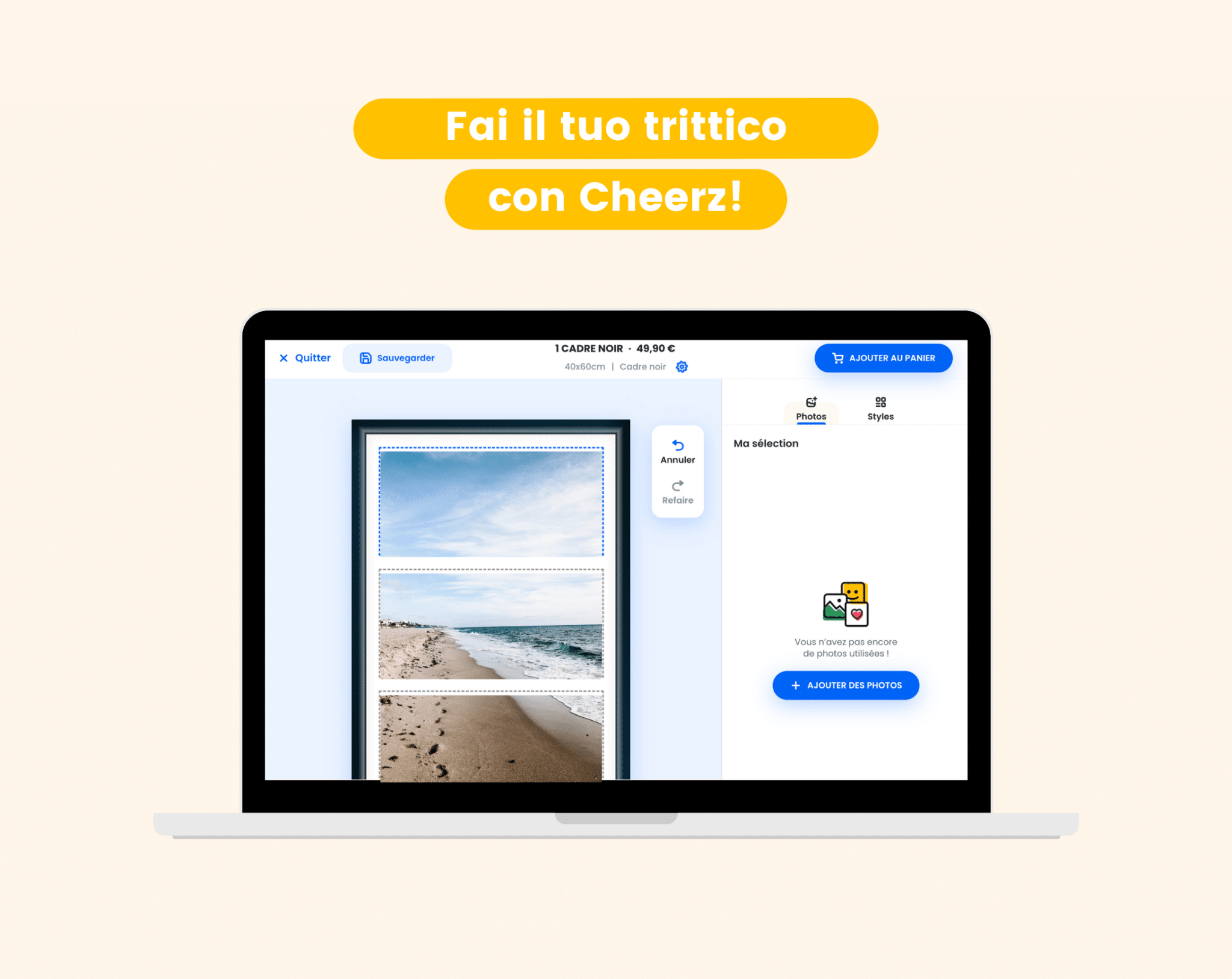 A differenza dei siti di stampa fotografica come CEWE, Photobox, Photoweb… Cheerz ti offre 3 diversi supporti (e materiali) per creare la tua composizione fotografica personalizzata. Per un prezzo inferiore rispetto all’acquisto di un trittico già pronto, hai la scelta: